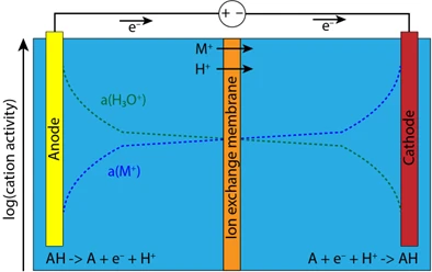 Ion transport in typical electrochemical systems. The net electron transport is accompanied by ion transport, often leading to ion activity gradients across the electrochemical cell.