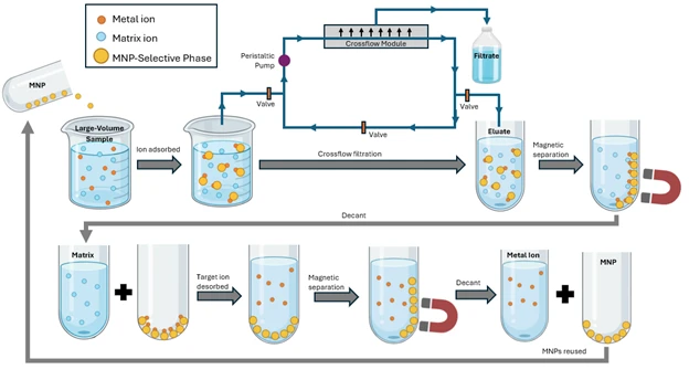 Metal-organic frameworks (MOFs) bonded to magnetic nanoparticles (MNPs) will be used for the extraction of Pd via crossflow ultrafiltration (CUF) and magnetic separation (MS)