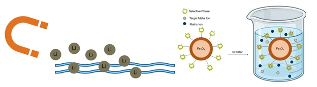 Given the typically low concentrations of target metals relative to competing ions, our research focuses on highly selective extraction techniques. We utilize advanced selective phases such as crown ethers (CEs) and metal-organic frameworks (MOFs), which exhibit strong affinity and specificity for desired metal ions. By anchoring these selective ligands onto magnetic nanoparticles (MNPs), we enable efficient separation and recovery of the entire complex from water using an external magnetic field—eliminating the need for energy-intensive filtration or chemical precipitation.