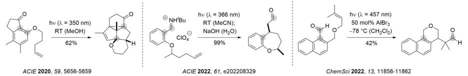 Eine der bemerkenswertesten Eigenschaften photochemischer Reaktionen besteht darin, Molekülgerüste zugänglich zu machen, die thermisch gar nicht oder sehr schwer zu erhalten sind. In diesem Zusammenhang beschäftigen wir uns mit photochemisch induzierten Reaktionskaskaden, bei denen mehrere photochemische Schritte aneinandergereiht werden oder ein photochemischer Schritt eine nachfolgende Umlagerung ermöglicht. Gezeigt sind unten von links nach rechts eine Dreiphotonenkaskade ausgehend von einem 1-Indanon, eine formale intramolekulare Carboformylierung eines Olefins, sowie die Lewis-Säure-katalysierte Bildung von Benzoisochromanen aus 1-Naphthaldehyden. In allen drei Fällen eröffnet eine ortho-Photocycloaddition die jeweilige Reaktionskaskade. Die Reaktion der Iminiumionen kann auch mit sichtbarem Licht und einem geeigneten Sensibilisator durchgeführt werden. Die Reaktionskaskade der 1-Naphthaldehyde gelingt mit chiralen Oxazaborolidinen als Lewis-Säuren mit hoher Enantioselektivität und deutlich höheren Ausbeuten.