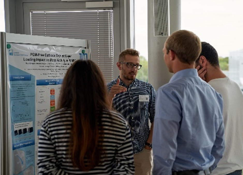 The ECS Student Chapter Munich hosted its 3rd symposium on 24th September 2019 in the rooms of the Institute of Advanced Study at the Technical University of Munich. Thanks to joint efforts of the chapter members and funding from BMW, Hereaeus, ECS, BioLogic and PINE, seven invited speakers and around 80 attendees could be hosted, amongst them a visiting group from the ECS student chapter in Ulm. Marc Koper from Leiden University gave insights into the world of platinum electrochemistry providing a lot of mechanistic details and new findings regarding cathodic dissolution of platinum. Electrocatalysis was also the focus of Karl Mayrhofer’s work at the Helmholtz Institute Erlangen-Nürnberg. He explained how to evaluate the catalyst’s activity, stability and selectivity and how online coupling of analytical techniques to electrochemical flow cells helps to evaluate those. Thomas Schmidt from the Paul-Scherrer Institute in Villigen, Switzerland is well-known for his work on oxygen evolution catalysts and he shared the latest findings from operando studies with his audience. He showed that the chemical composition of an as-synthesized IrOx and a heat-treated IrO2 remains constant during operation, whereas the morphology is altered only in the case of the as-synthesized IrO2. This topic was picked up by Peter Strasser from Technical University of Berlin, who intrigued the audience not only by new findings on the catalytic “dark side” of solar fuels and chemicals, showing by doping IrOx with nickel improved OER activity is reached. Moreover, he was also pointing out how the most significant results are achieved by a strong spirit of collaboration between scientists. After digging deep into the world of fundamental research, Andreas Peschel shifted to the focus to industrially relevant topics. He elucidated the technical processes for hydrogen distribution developed by Linde AG and one got the impression that Germany is prepared for a much higher number of fuel cell cars than found on the streets right now.